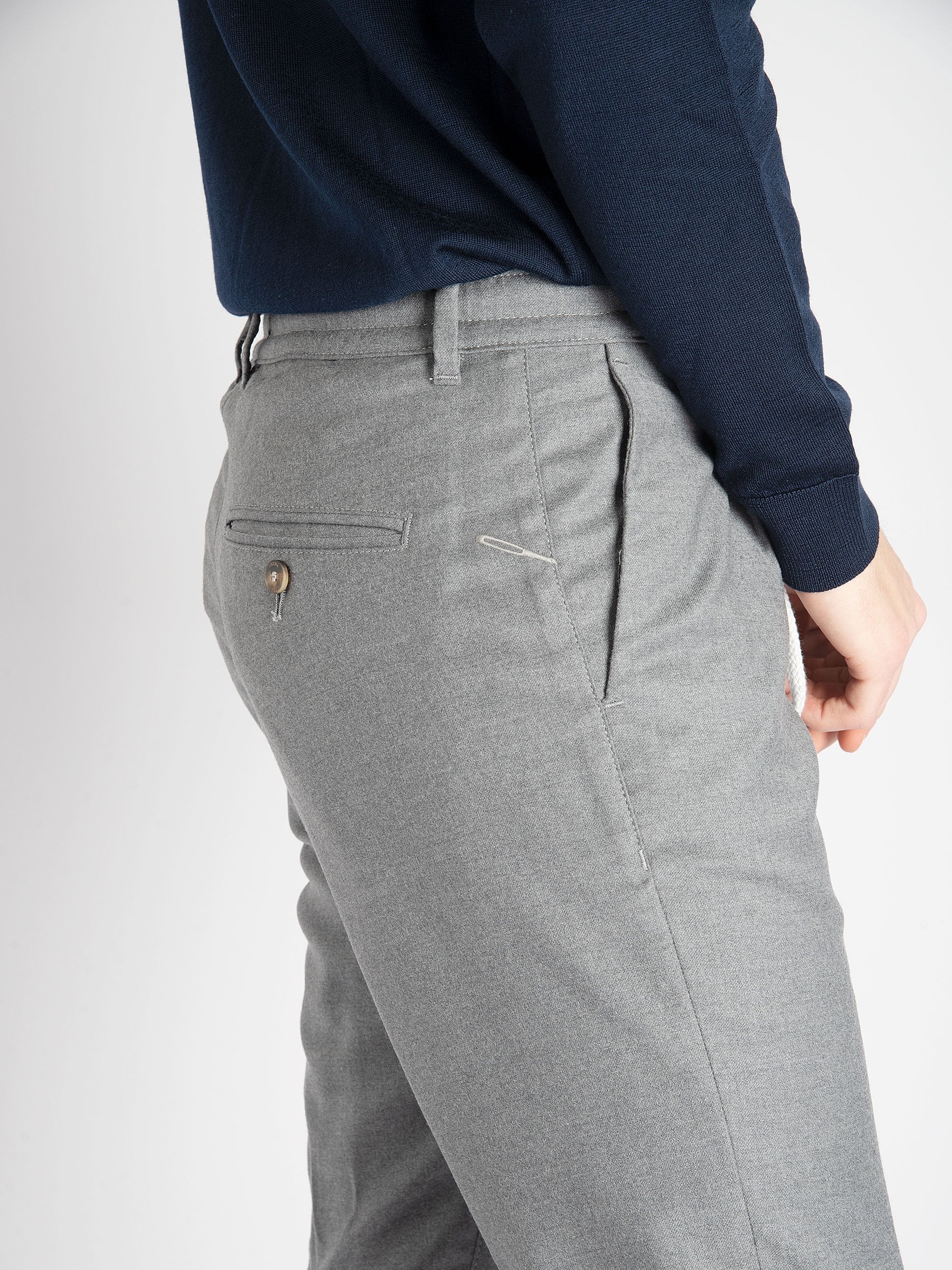 • Tasche ventre piatto laterali e a filetto e con bottone sul retro.