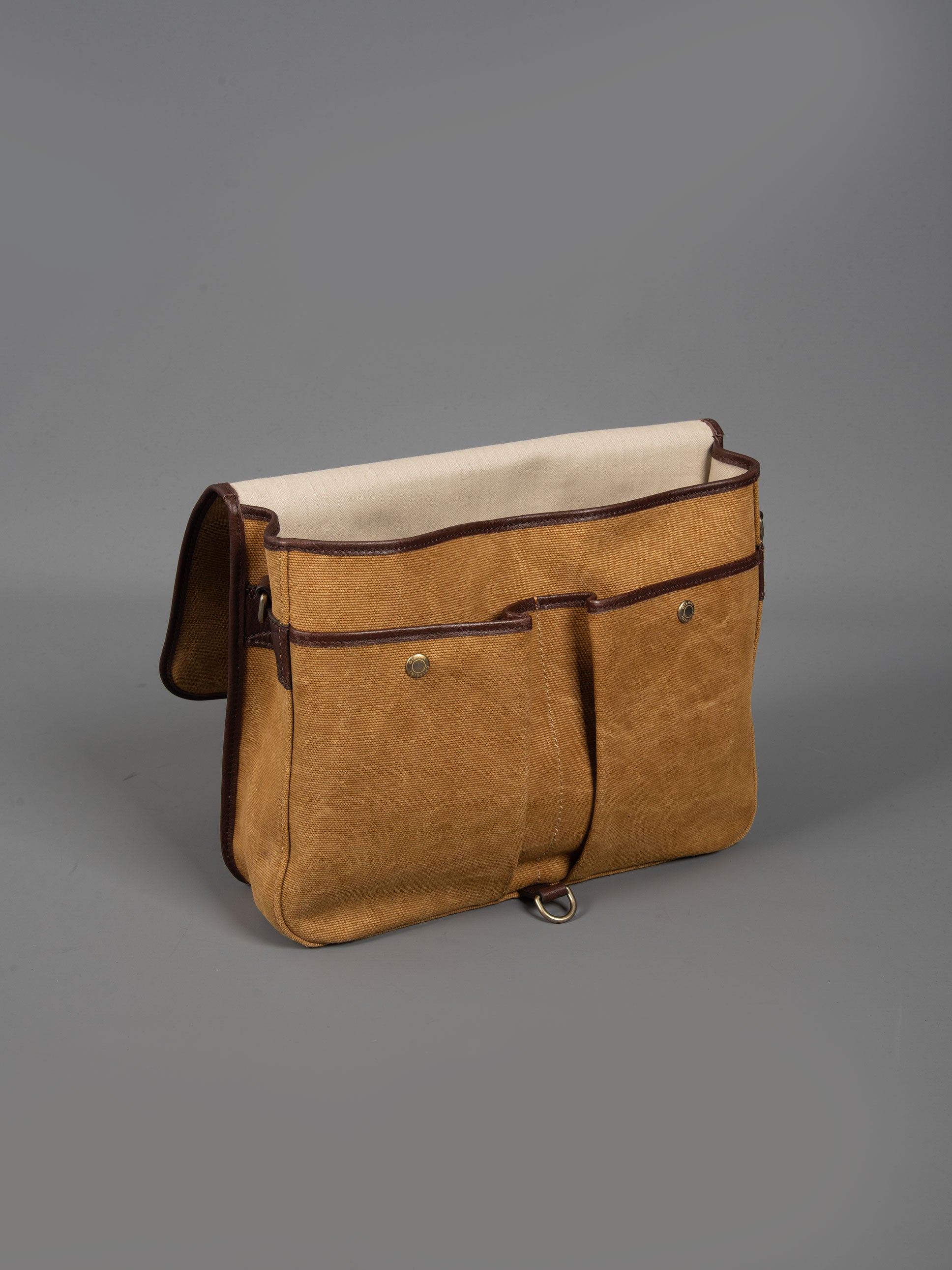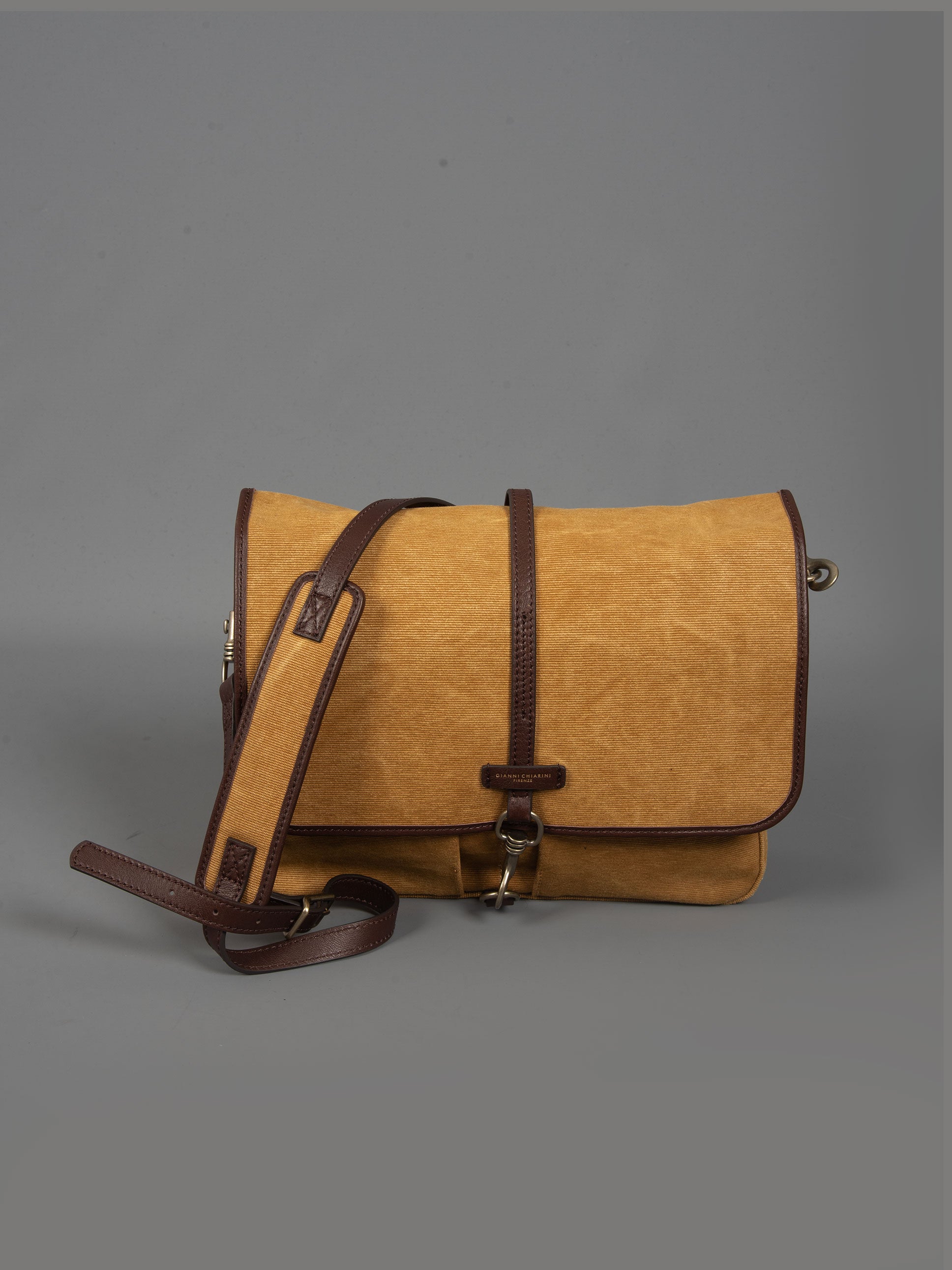 • Chiusura con patta rifinita in pelle e moschettone.