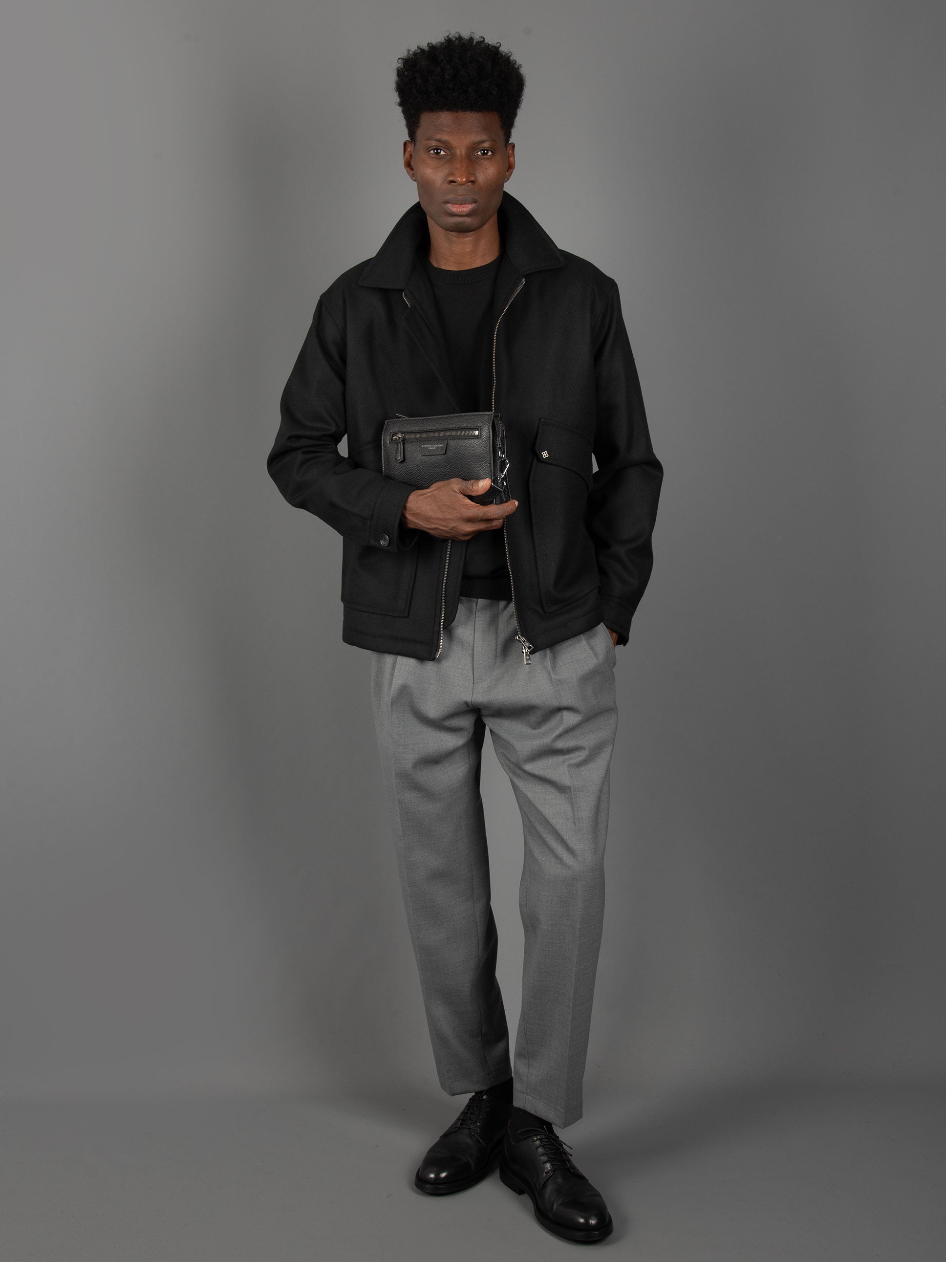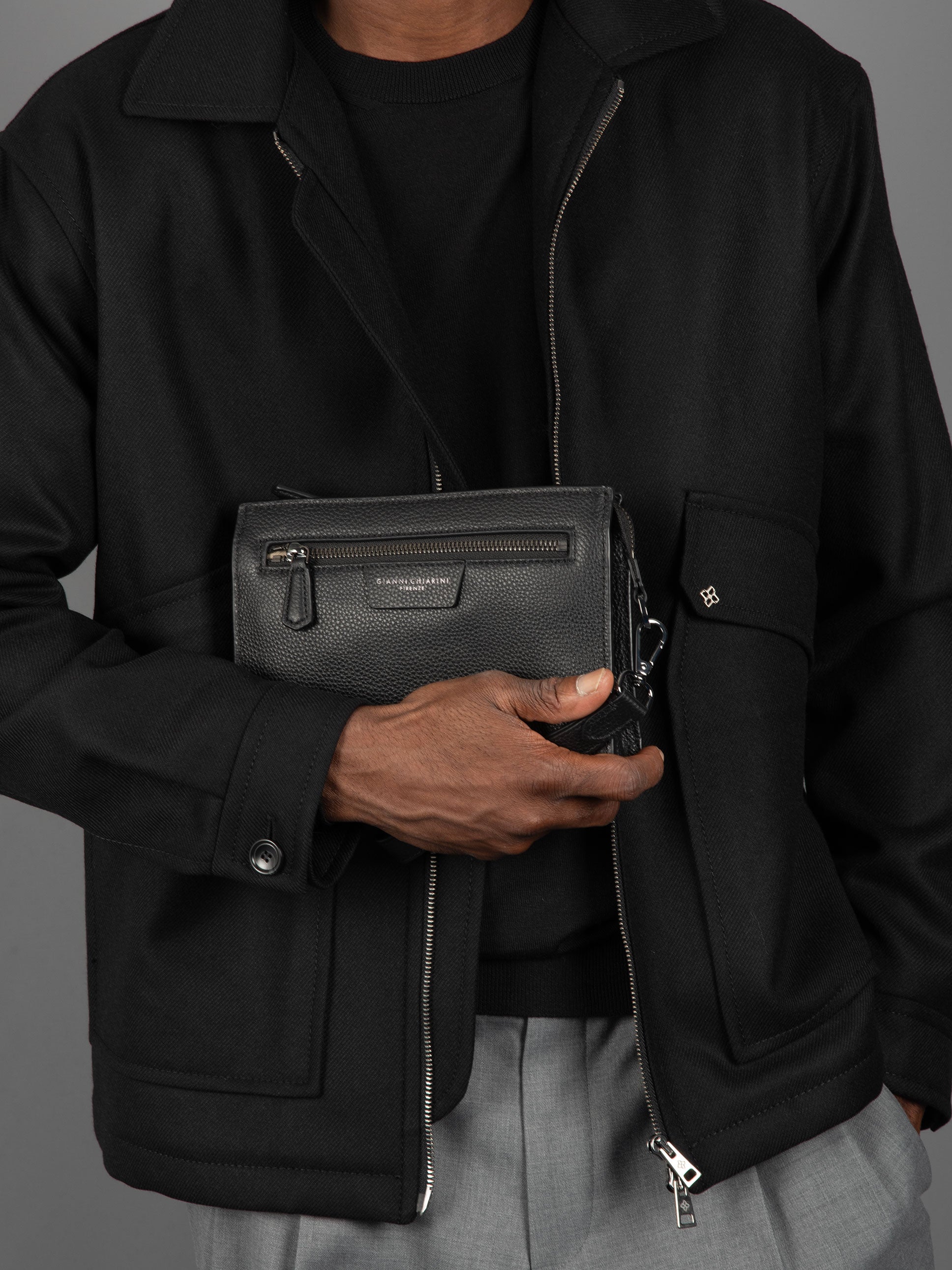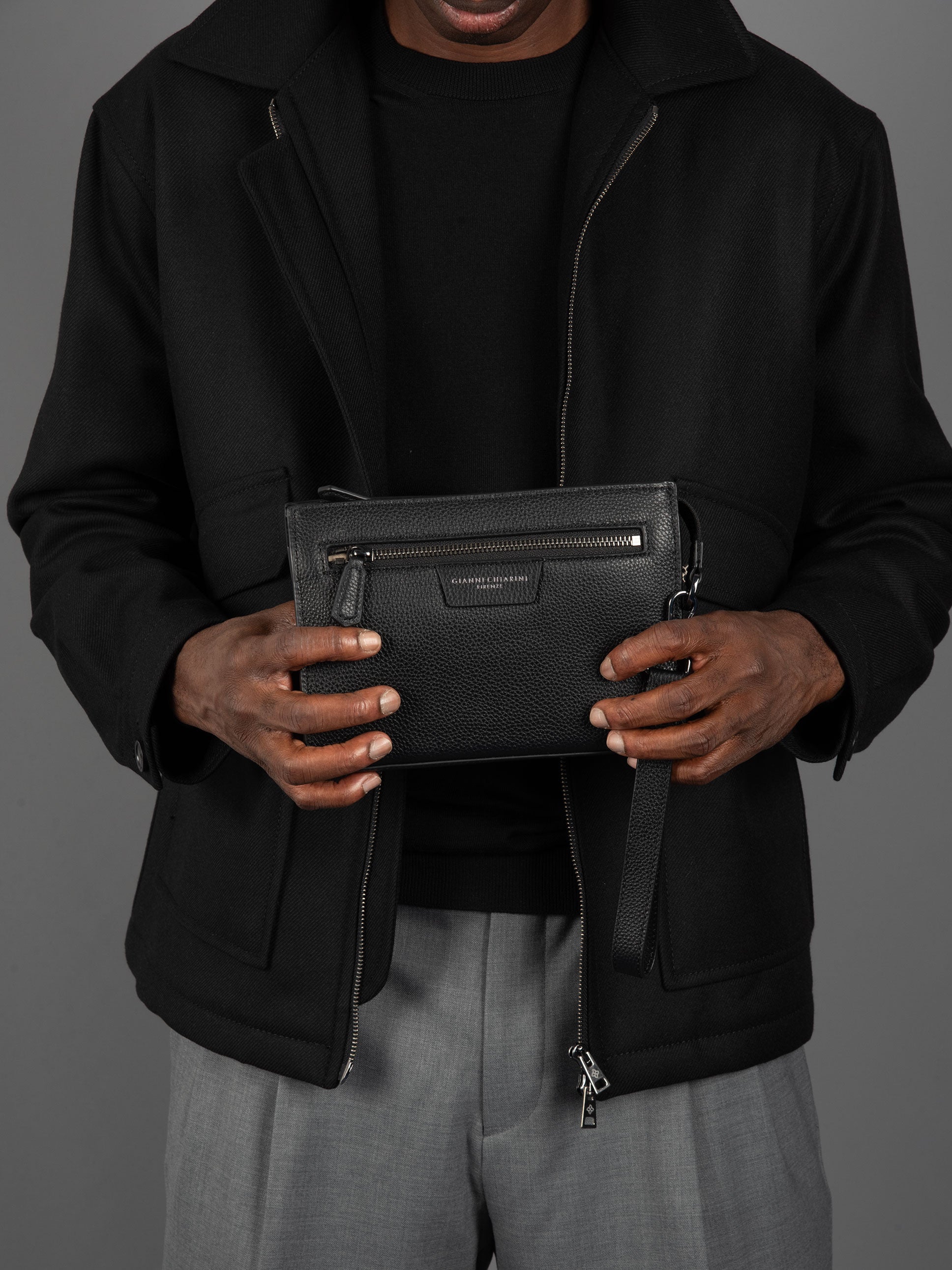 • Chiusura con zip in metallo e dotata di manico in pelle rimovibile.