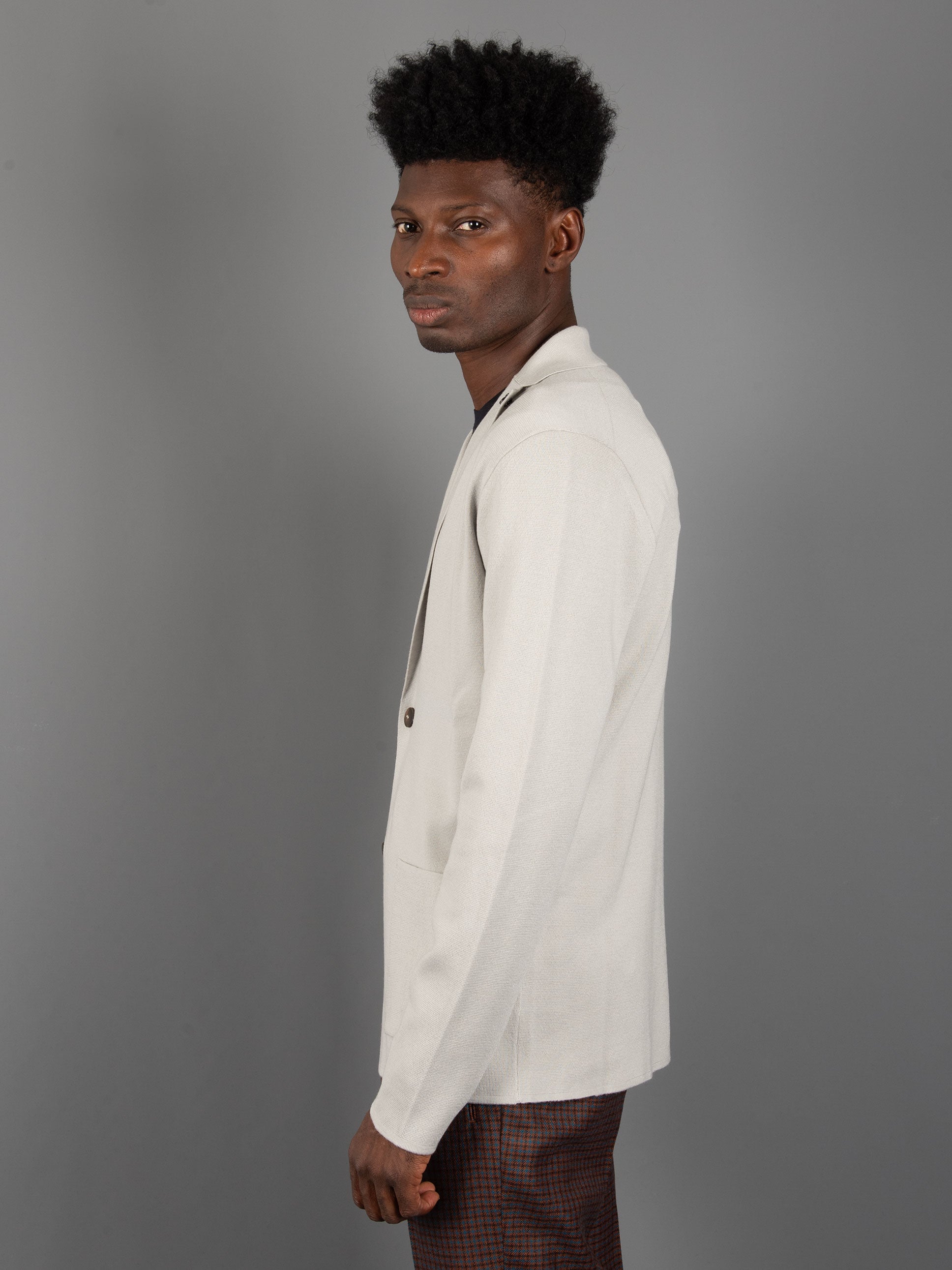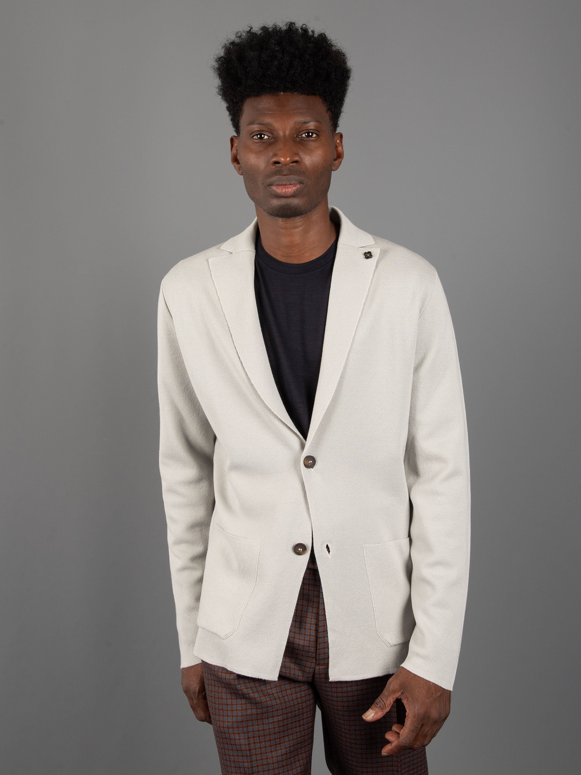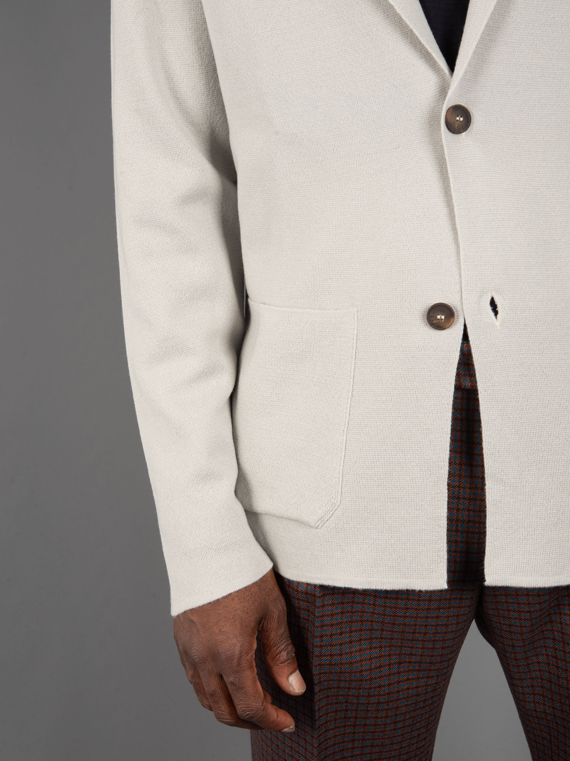 Scollo giacca con rever e tasche applicate sul fondo.