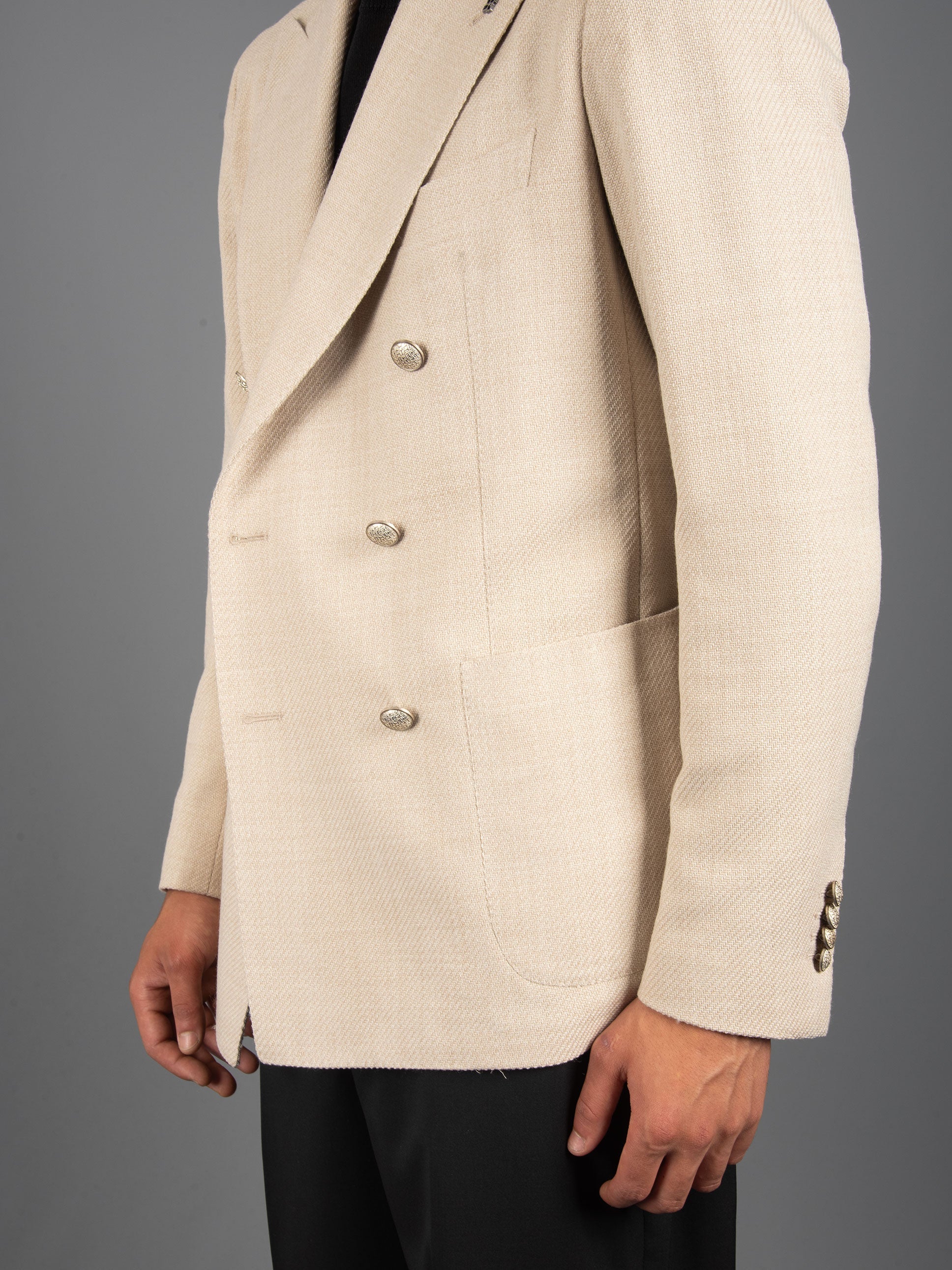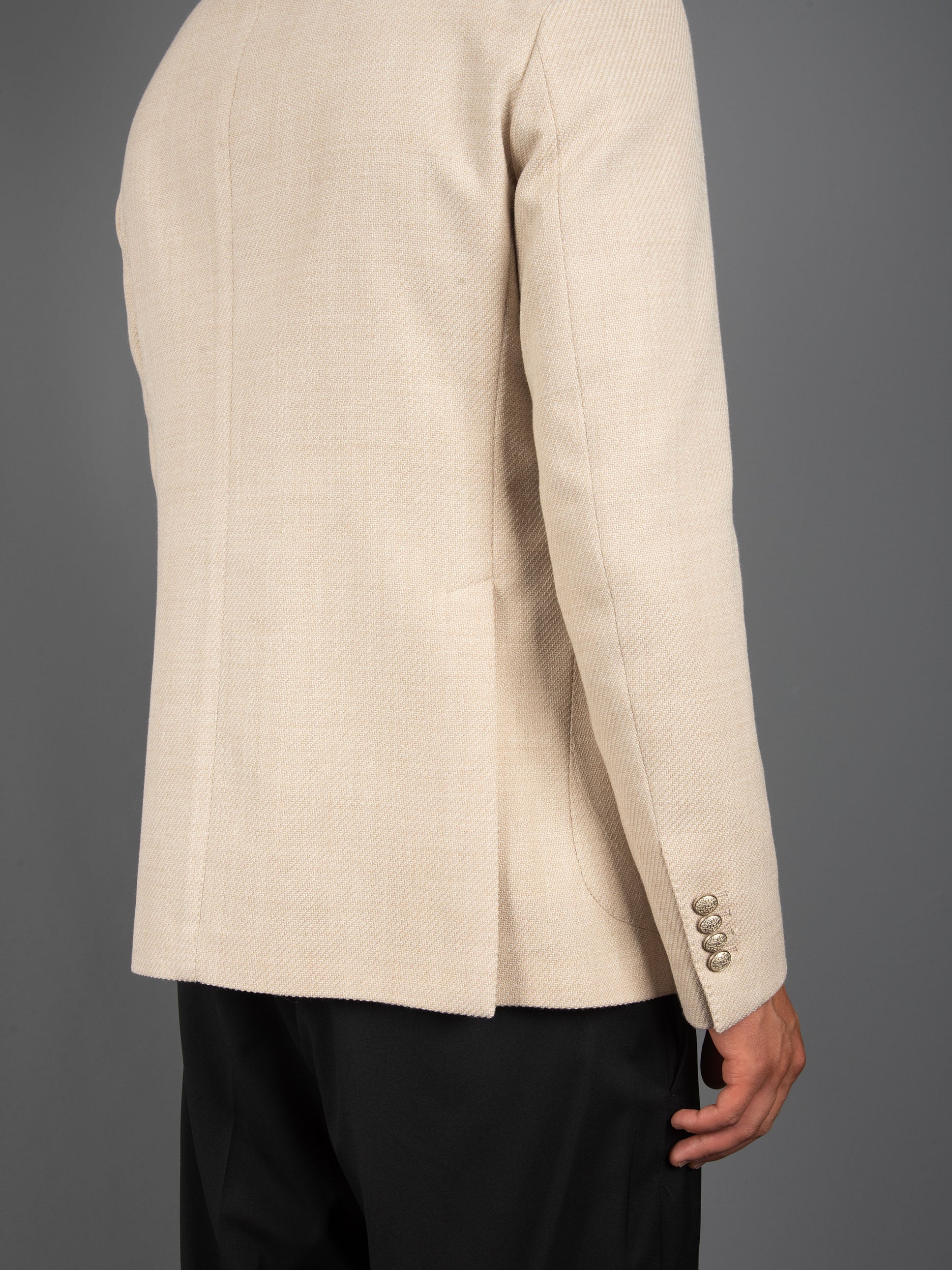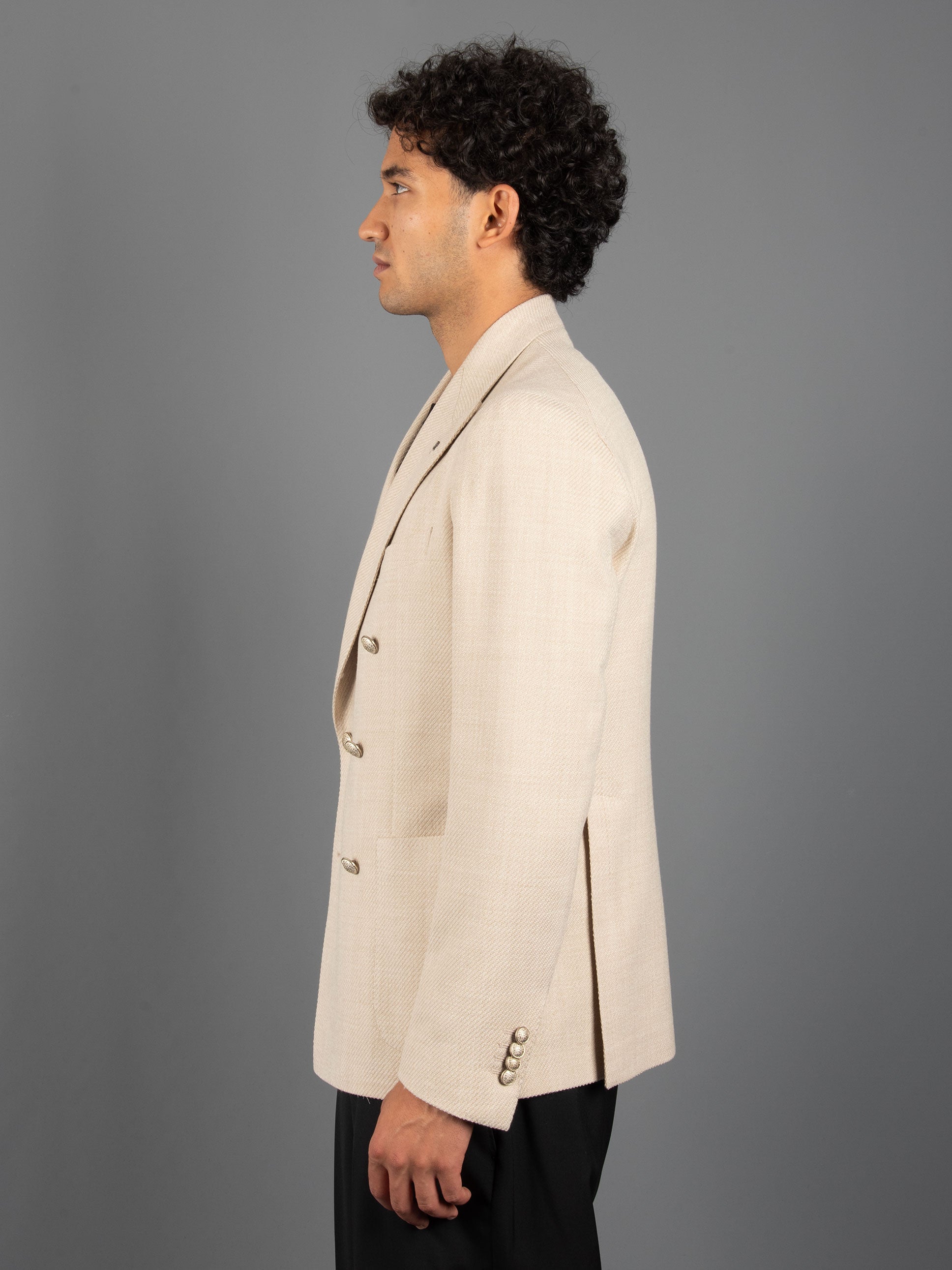 - Giacca sfoderata doppiopetto in lana lavorata a cesto.