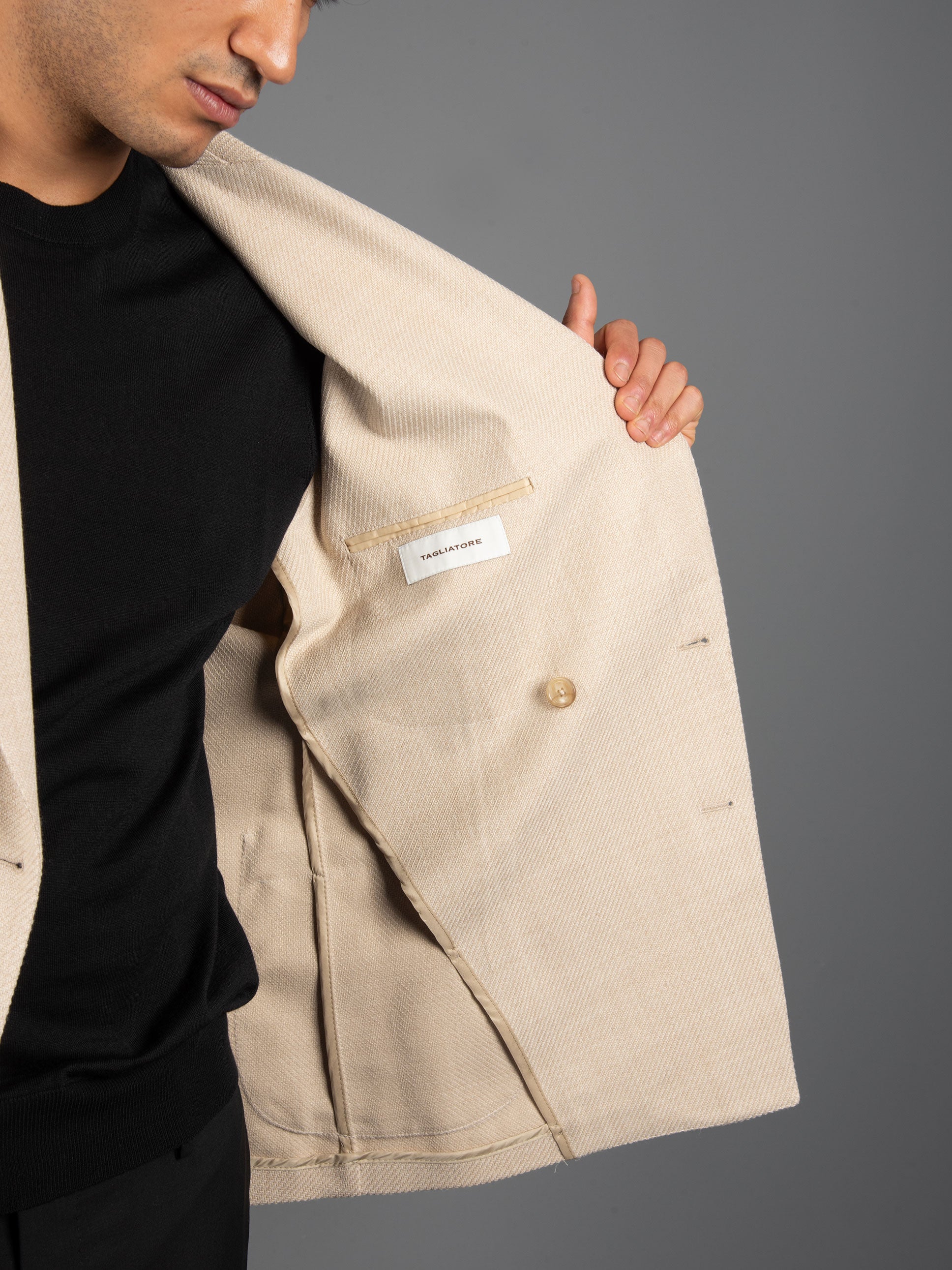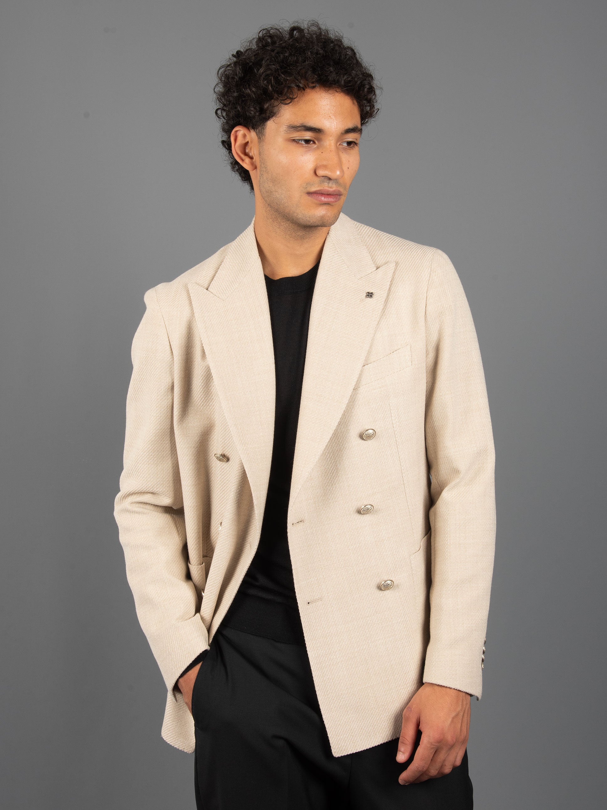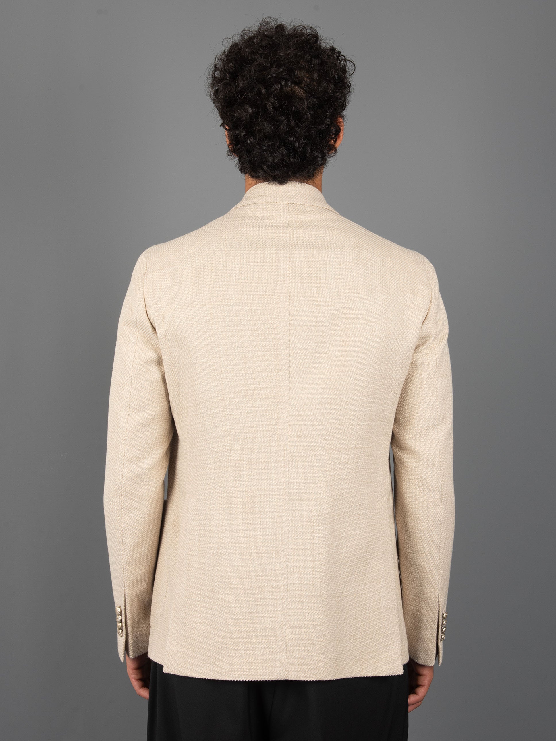 - Giacca sfoderata doppiopetto in lana lavorata a cesto.